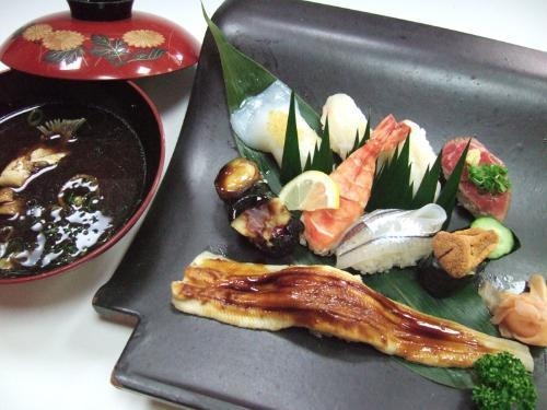 特選にぎり・・・2,420円ジャンボ赤だし本物の淡路瓦に盛った、淡路島選りすぐりの魚のにぎりをお楽しみください。