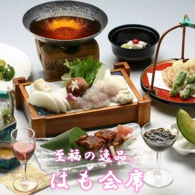 【 食前酒/小鉢/はもスープ仕立鍋/はも天ぷら/はも焼霜サラダ/はも棒すし/はも吸物/フルーツ 】